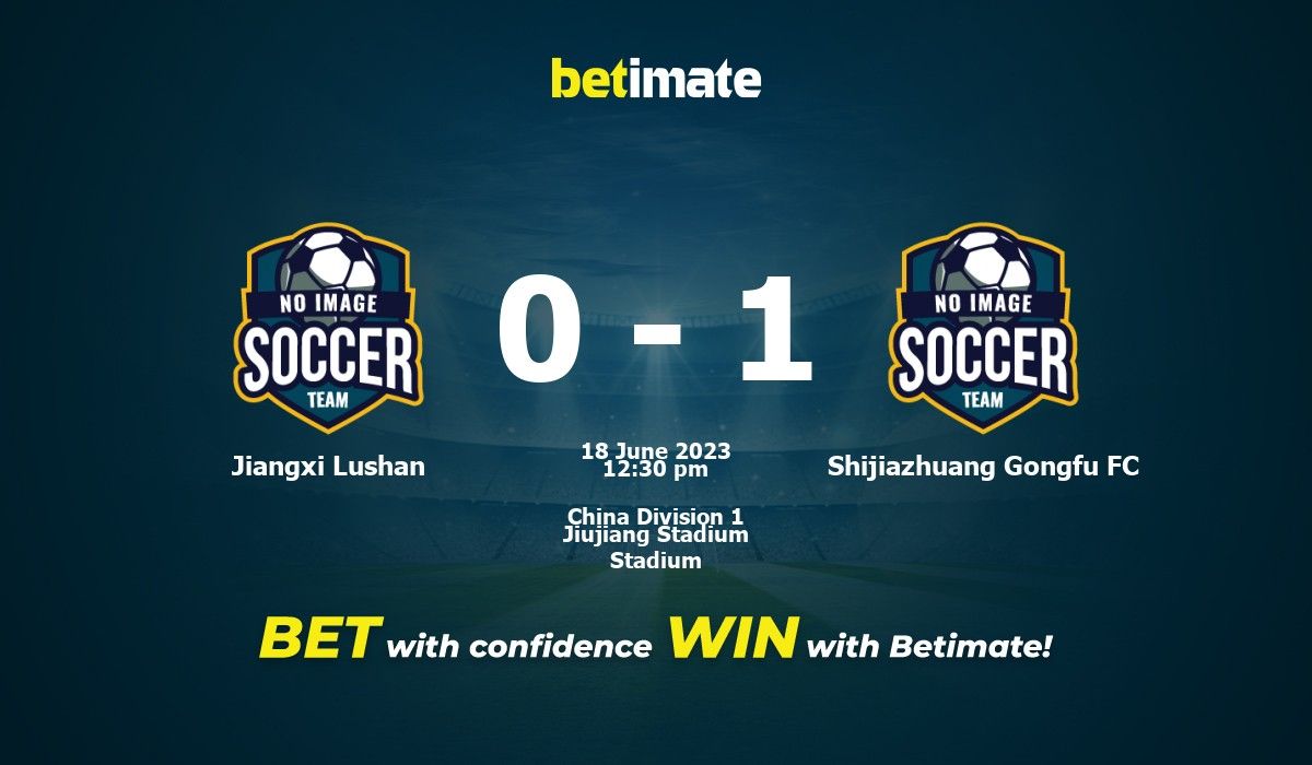 Shijiazhuang Gongfu FC vs Jiangxi Lushan Oct 10, 2023 Timeline 0' HT 5 ' 41 ' FT. 1 Goals 1 6 Corners 1 0 Penalties 0 0 Red Cards 0 1. Shijiazhuang Gongfu FC - Jiangxi Lushan H2H China Division 1 07:30 Mar 23, 2024 Jiangxi Lushan 1 - 2 Shijiazhuang Gongfu FC.