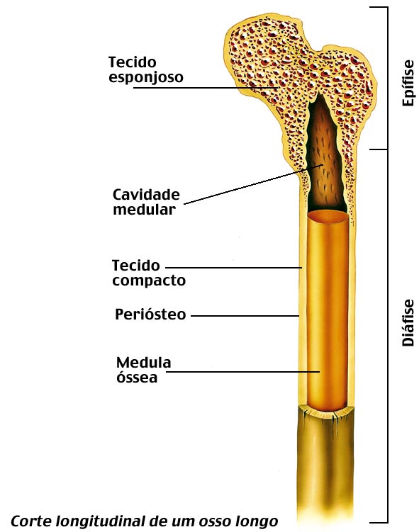 Exemplos típicos são os ossos do esqueleto apendicular: fêmur, úmero, rádio, ulna, tíbia, fíbula, falanges. Observe como o osso longo apresenta duas extremidades, denominadas epífises e um corpo, a diáfise. Por esta razão, boa parte dos ossos longos apresentam um canal central, também conhecido como canal / cavidade medular.